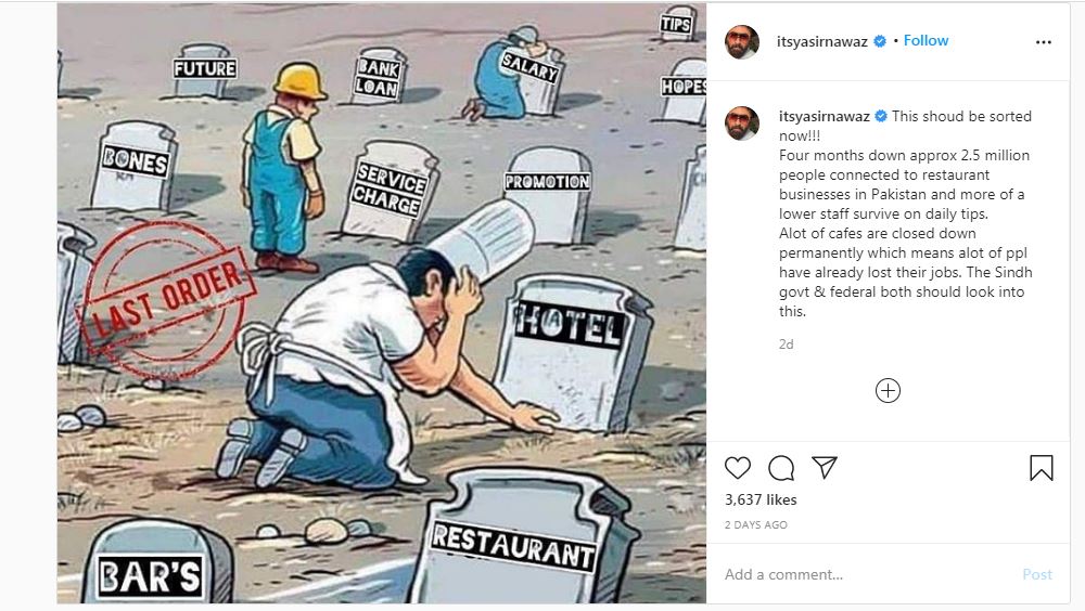 The actor took to social-networking website and shared a heartbreaking photo, saying, “Four months down approx 2.5 million people connected to restaurant businesses in Pakistan and more of a lower staff survive on daily tips.